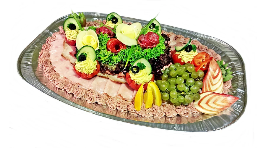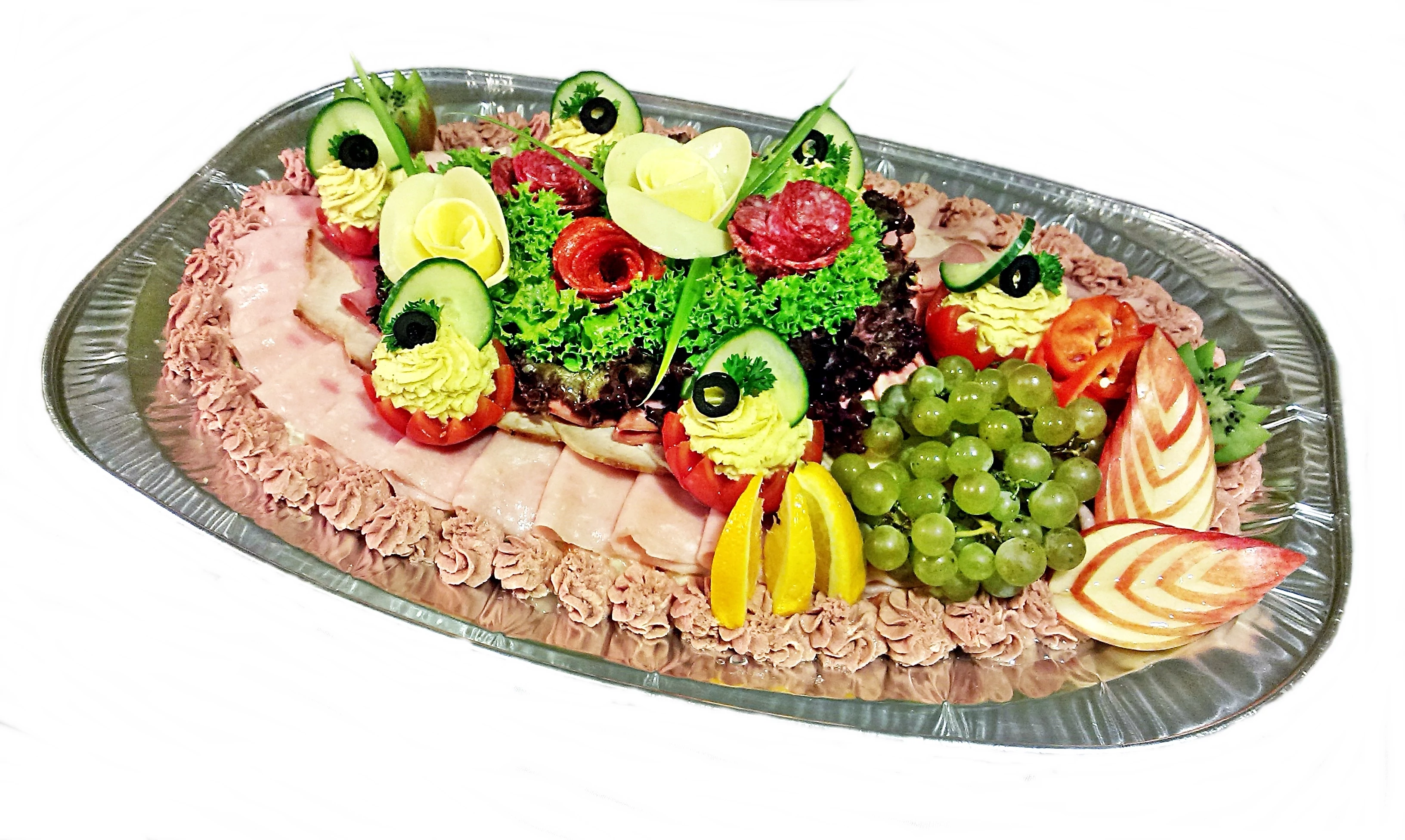 Választható saláta alap, töltött paradicsom, csabai töltött karaj, sült tűzdelt sertés karaj, füstölt főtt tarja, sonkaszeletek, téliszalámi, paprikás szalámi, sajt, bőséges és exkluzív zöldség-gyümölcs díszítés.