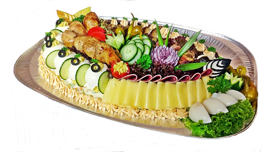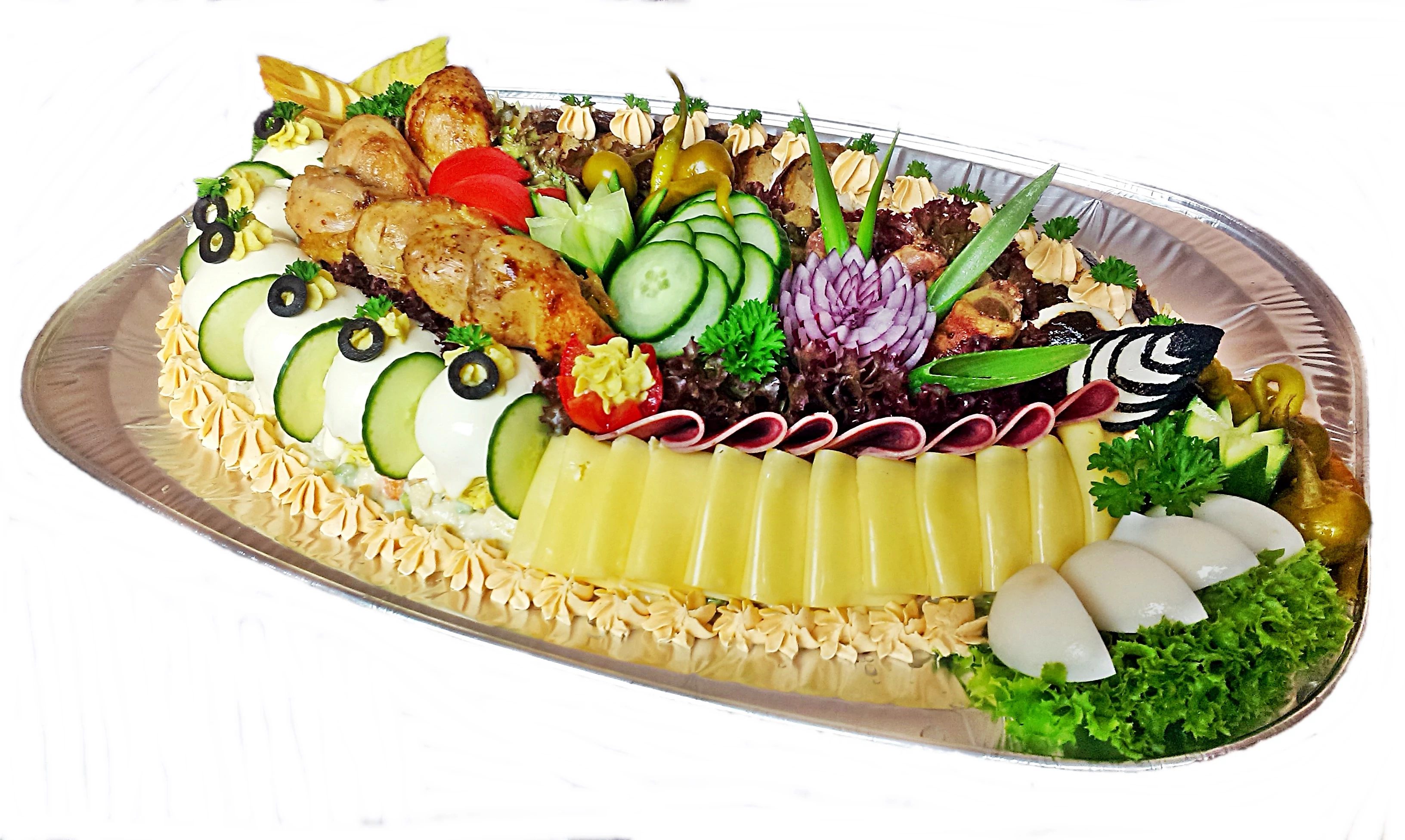 Választható saláta alap, kaszinótojás, sült csirkecomb, sajt szeletek, füstölt főtt marhanyelv szeletek, töltött csirkecomb szeletek, csirkemáj bacon köntösben sülve és exkluzív zöldség-gyümölcs díszítés.