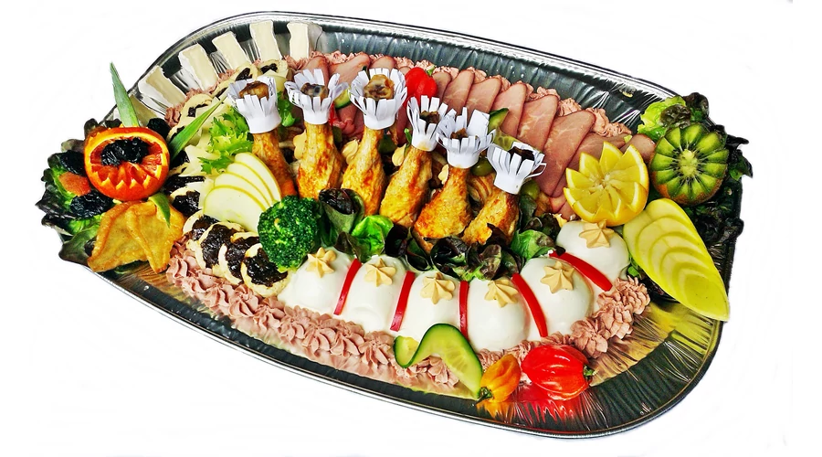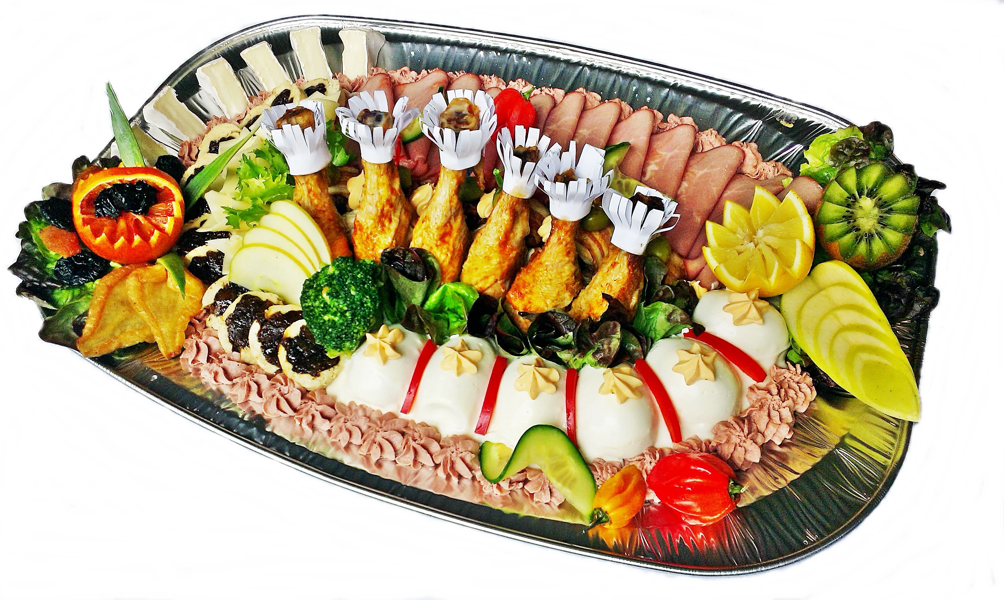 Választható saláta alap, kaszinótojás, sült csirkecomb, csabai karaj szeletek, fűszeres sonka szeletek, aszalt szilvás jérce galantin, camambert és exkluzív zöldség-gyümölcs díszítés.