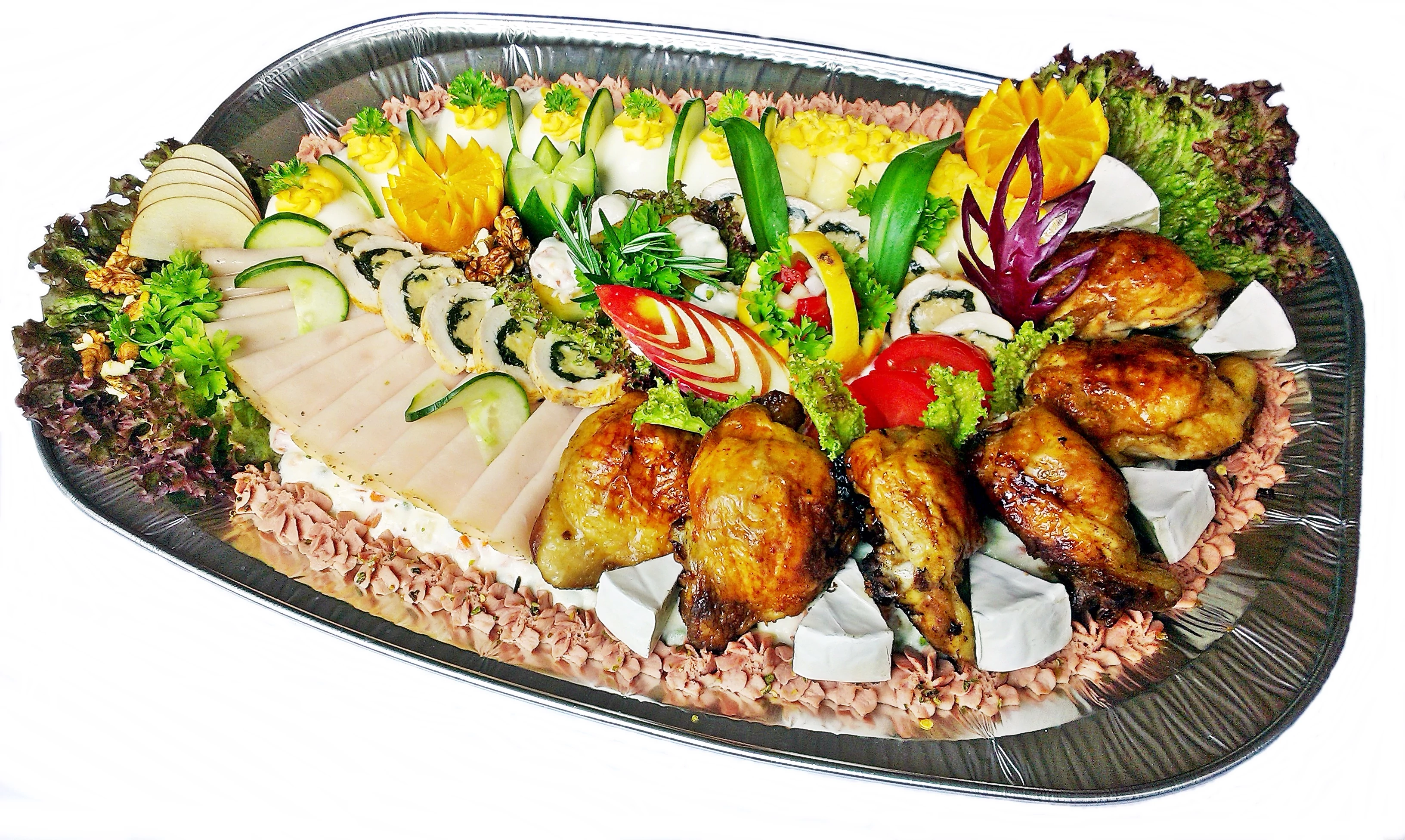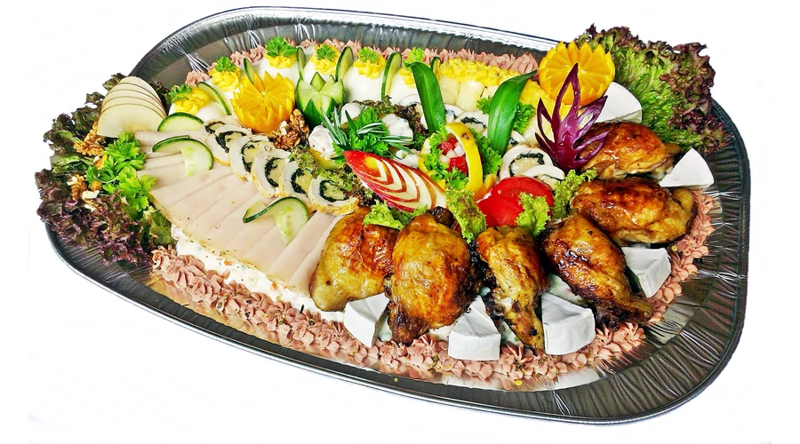Választható saláta alap, kaszinótojás, sonka szeletek, tojáskrémes sajttölcsér, gödöllői töltött csirkecomb, szárnyas galantin, camambert sajt, bőséges és exkluzív zöldség-gyümölcs díszítés.